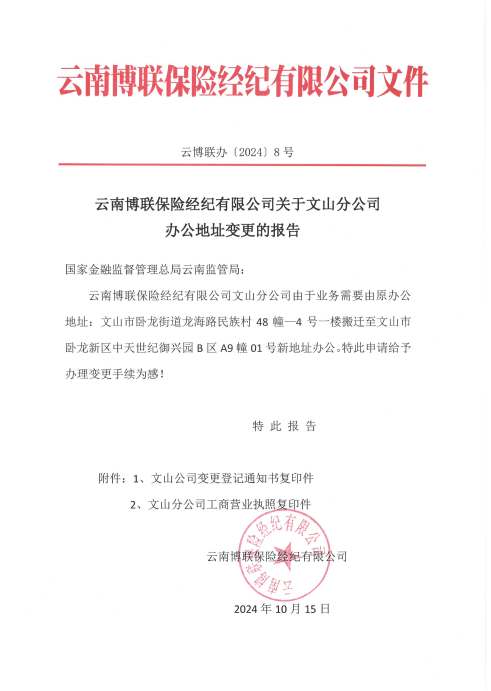 云南博聯(lián)保險經(jīng)紀(jì)有限公司關(guān)于文山分公司辦公地址變更的報告