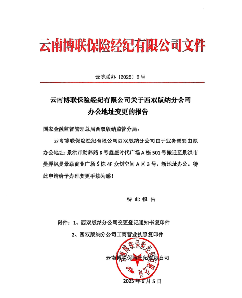 云南博聯(lián)保險經紀有限公司關于西雙版納分公司辦公地址變更的報告